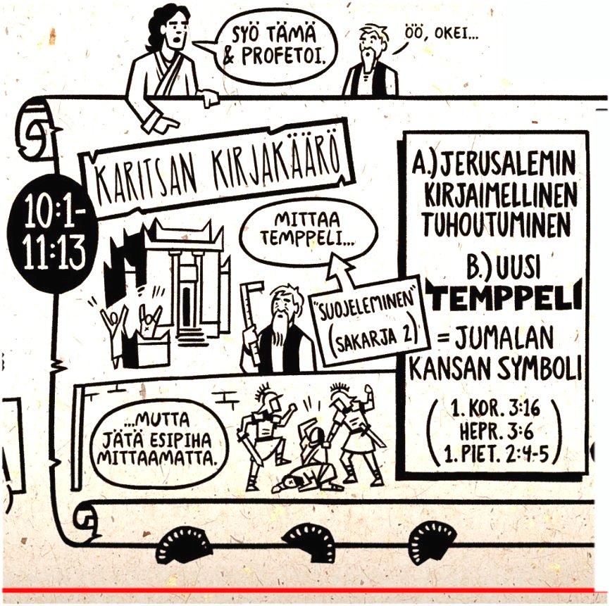 10- 11:19 Olemme samanlaisessa välinäytöksessä kuin ensimmäisen ja toisen voi-huutojen välillä oli ns. "hengähdystauko". Pasuunat antavat odottaa seitsemättä puhallusta. Odotuksen aikana on avattu seitsemäs pieni käärö (käärönen), enkelin kädessä. Enkeli muistuttaa Kristusta. Samalla annetaan Johannekselle erikoinen tehtävä: häntä kehotetaan syömään käärö. Kirjasen salaisuuden pohjana on Vanhassa Testamentissa lähinnä